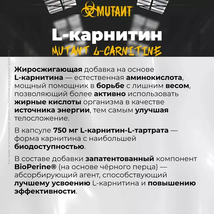 Л-Карнитин в капсулах Mutant Carnitine 750 mg — это высококачественная добавка, предназначенная для поддержки физической активности и улучшения обмена веществ. В каждой упаковке содержится 90 капсул, что обеспечивает длительный курс приема.
