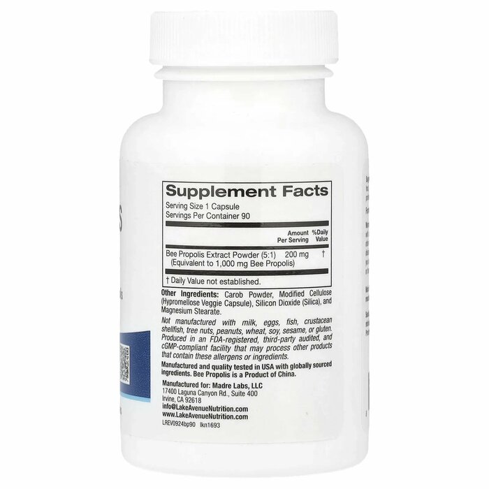 Пчелиный прополис от Lake Avenue Nutritionсодержит экстракт пчелиного прополиса в соотношении 5:1, что эквивалентно 1000 миллиграммам пчелиного прополиса. Одна упаковка рассчитана на прием в течение примерно 3 месяцев (при соблюдении рекомендованной дозы).