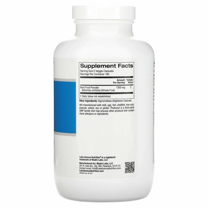 Порошок из плодов нони от Lake Avenue Nutrition содержит порошок из цельных плодов нони в вегетарианских капсулах. Он подходит для вегетарианцев и веганов и не содержит глютена, ГМО и сои.