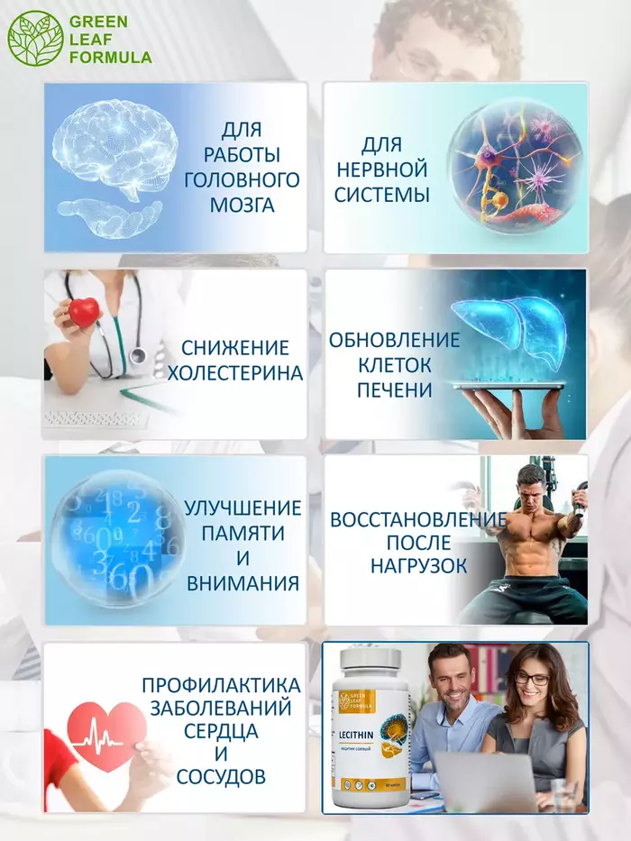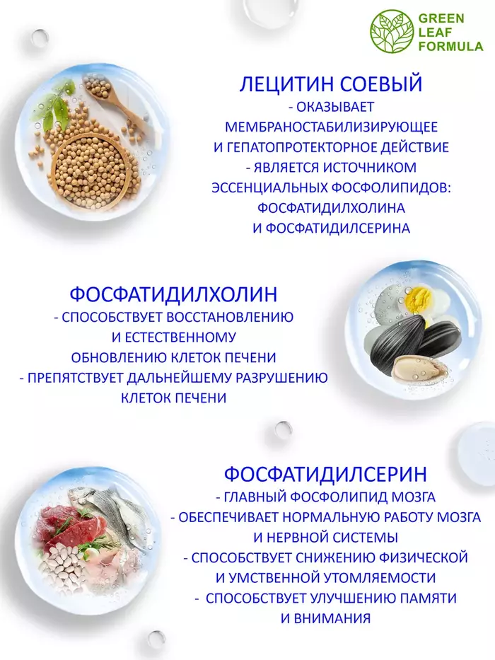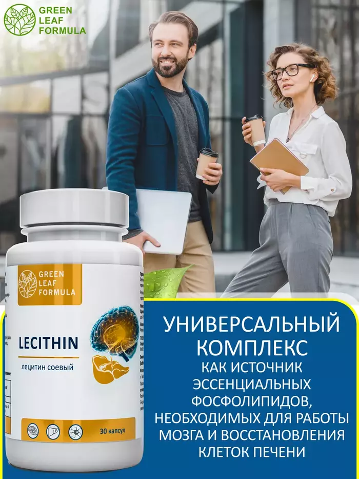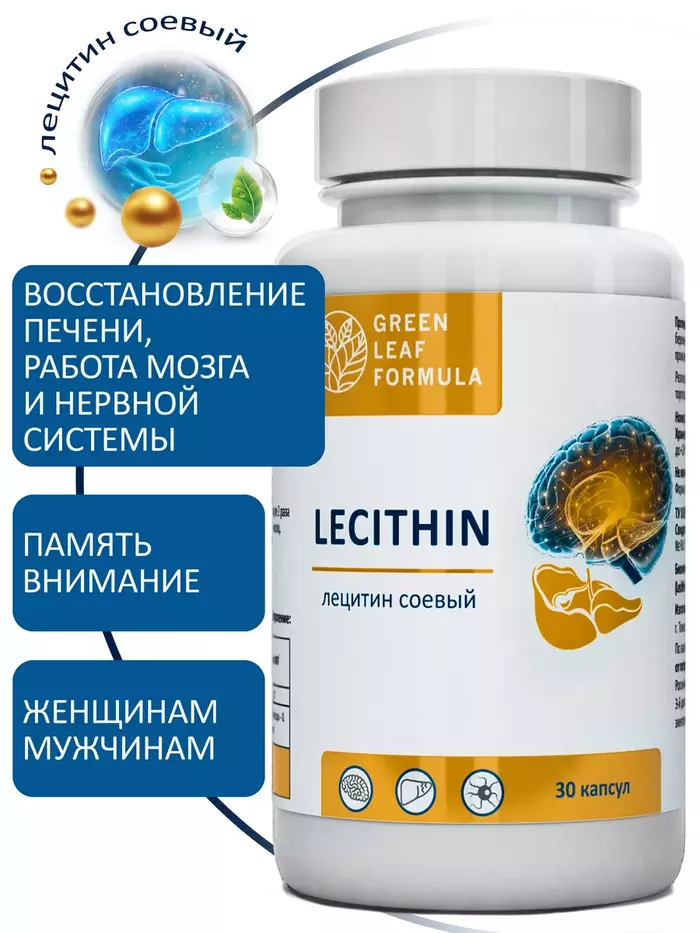 LECITHIN это универсальный биологически активный комплекс на основе соевого лецитина для печени, для мозга, для нервной системы, для сердца и сосудов, профилактика развития атеросклероза и сопутствующих ему заболеваний (инсульта и инфаркта). БАД для женщин и мужчин (витамины для женщин и мужчин), пожилым людям, спортсменам (для спорта витамины). Источник эссенциальных фосфолипидов (фосфатидилхолина и фосфатидилсерина), необходимых для нормальной работы головного мозга и нервной системы, восстановления печени на клеточном уровне, повышения физической выносливости и восстановления после тяжелых физических нагрузок. Лецитин является одним из главных компонентов для мозга и нервной системы:• Является строительным материалом 30% сухой массы мозга и 17% нервной системы состоит из лецитина.• Синтезируется человеческим организмом, но расходуется при физических и умственных нагрузках.• Нехватка лецитина приводит к раздражительности, нервным срывам и усталости.• Поддерживает и восстанавливает высшие когнитивные функции мозга: память, речь, моторика головного мозга.• Прием лецитина приводит к ремиссии при рассеянном склерозе. Лецитин необходим для здоровья ЖКТ и сердечнососудистой системы:• Улучшает работу пищеварительного тракта, поскольку входит в состав желчи. Стимулирует желчевыделение, что способствует очистке печени, устраняет дискинезию желчных путей, препятствует образованию желчных камней.• Рекомендован при хроническом активном гепатите.• Способствует снижению уровня холестерина в крови и препятствует его отложению в стенках кровеносных сосудов.• Способствует снижению уровня артериального давления. Для спортсменов:• За счет большого содержания соевого протеина лецитин помогает в наборе массы и сжигании жира.• Увеличение содержания фосфолипидов в мышцах способствует повышению их выносливости.• Лецитин помогает восполнить уровень холина после высоких физических нагрузок. Каждая партия лецитина проходит дополнительный лабораторный контроль на наличие ГМО.Не содержит: диоксид титана, химический краситель, ГМО, глютен.Витамины и БАДы Green Leaf Formula это забота о вашем здоровье каждый день.Вся наша продукция сертифицирована и изготавливается на одном из ведущих российских производств, проходя многоэтапный контроль качества. Непрерывный лабораторный контроль входного сырья и готовой продукции ведется лабораторией, аккредитованная в национальной системе Росаккредитации. Соответствие международным стандартам ISO 22 000 : 2005, GMP и серьезная научная база, гарантируют потребителю приобретение продукта высочайшего качества.