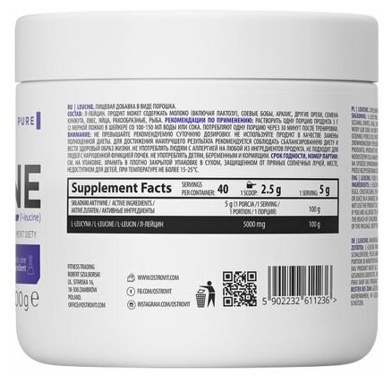 Лейцин от OstroVit представлен в виде порошка, который легко растворяется в воде или других напитках. Это делает его удобным для использования как до, так и после тренировки, а также в течение дня для поддержания уровня аминокислот в организме.