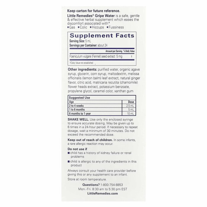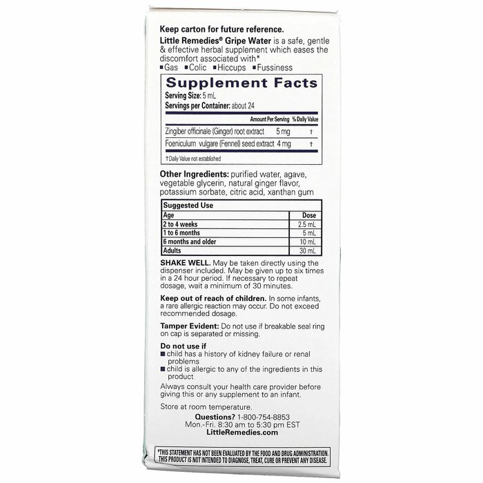 Little Remedies® Gripe Water - это высокоэффективная травяная добавка, которая облегчает дискомфорт в желудке, часто связанный с газами, коликами и икотой. В основе нашего продукта - проверенная временем формула из Европы, которой уже более 100 лет.