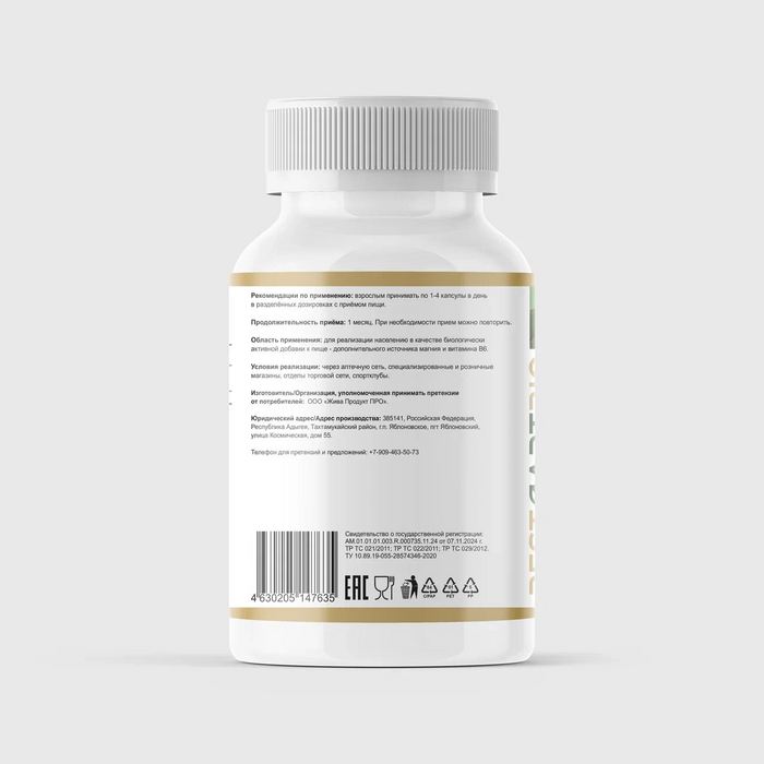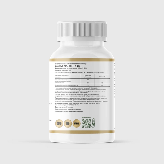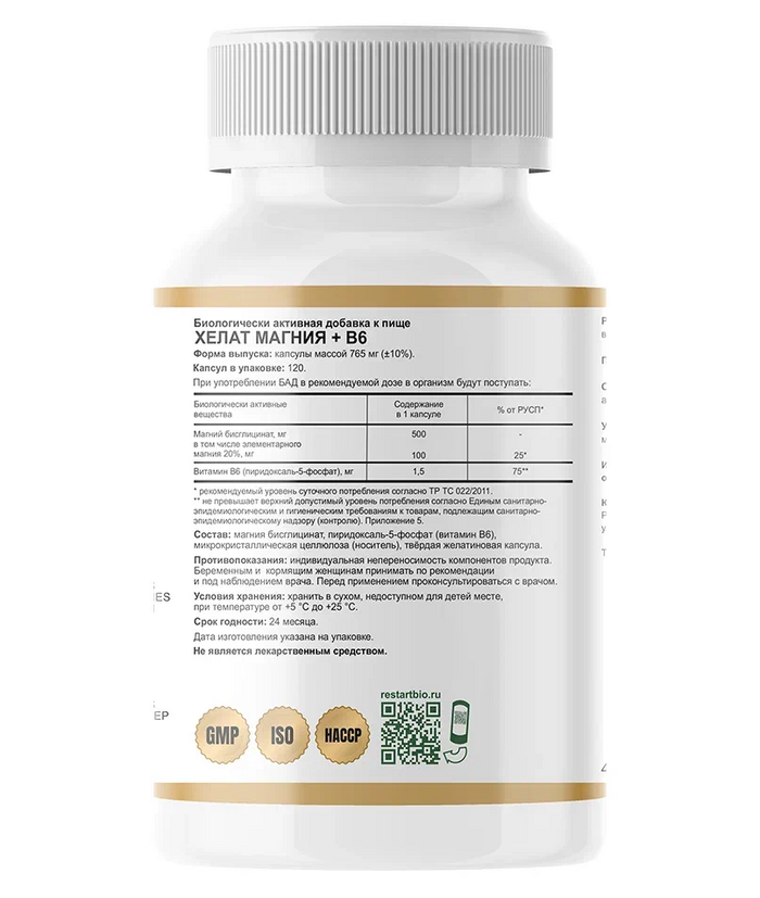 RestartBio Магний бисглицинат (500 мг) с витамином В6 (р-5-р), 120 капсул