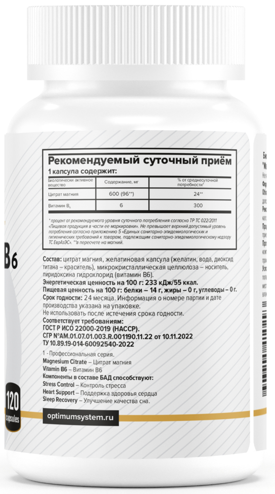 Optimum System Магний + витамин B6 представляет собой биологически активную добавку, разработанную для поддержания здоровья сердечно-сосудистой и центральной нервной систем. В состав каждой капсулы входит 600 мг цитрата магния и 6 мг витамина B6, что обеспечивает мощное синергетическое действие этих компонентов.
