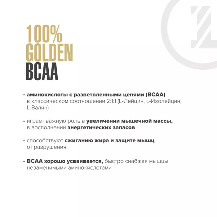 Maxler Аминокислоты 100% Golden BCAA порошок, 420 г — это высококачественная добавка, основанная на аминокислотах с разветвленной цепью (BCAA) в идеальной пропорции 2:1:1, которая способствует восстановлению и поддержанию мышечной массы. В составе продукта находятся три ключевые аминокислоты: лейцин, изолейцин и валин, которые активно участвуют в синтезе белка и стимулируют рост мышечной ткани, одновременно снижая уровень катаболизма. Это делает добавку важной частью рациона для тех, кто стремится к улучшению спортивных результатов и эффективному восстановлению.