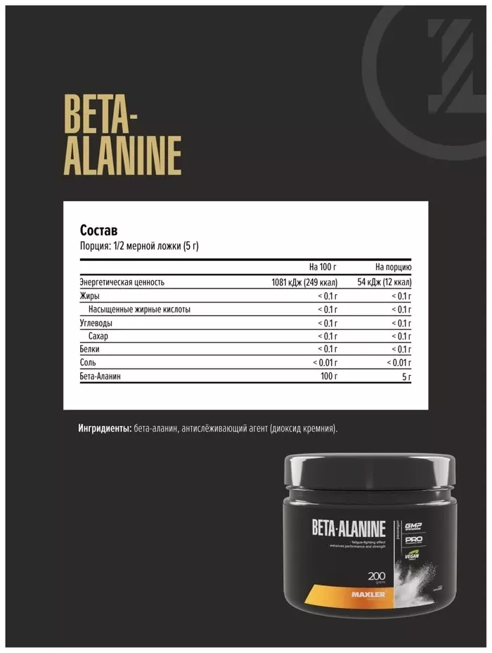 Бета-аланин от Maxler не содержит искусственных добавок и подходит для вегетарианцев. Рекомендуется использовать его перед тренировками для достижения максимального эффекта. Продукт идеально подходит для спортсменов, стремящихся улучшить свои результаты в силовых и выносливостных видах спорта.