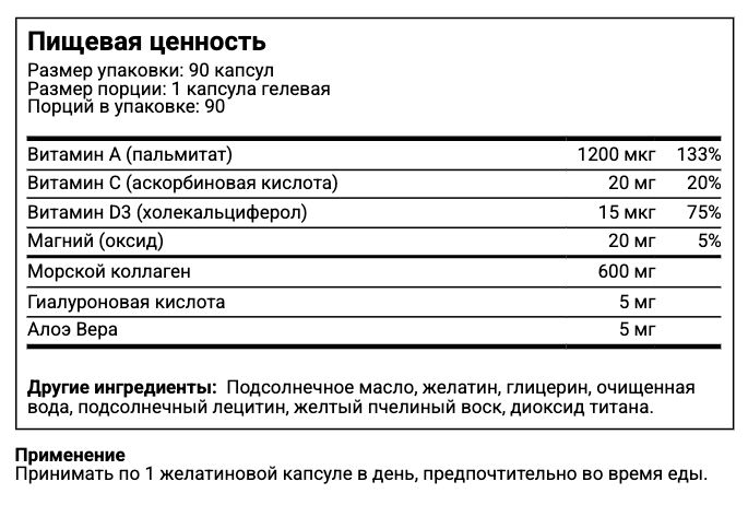 Для кожи, суставов и волос: 2 капсулы в день во время еды. Курс: минимум 3 месяца для выраженного эффекта. Запивать: водой или соком.