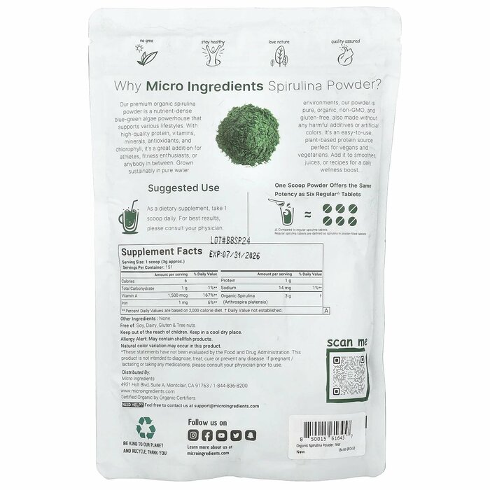 Наш премиальный органический порошок из спирулины - это богатый питательными веществами сине-зеленые водоросли, поддерживающие любой образ жизни. Благодаря высококачественному белку, витаминам, минералам, антиоксидантам и хлорофиллу он является отличным дополнением для спортсменов, любителей фитнеса и всех, кто с ними сталкивается. Наш порошок, выращенный экологически безопасным способом в чистой воде, является чистым, органическим, без ГМО и глютена, а также без каких-либо вредных добавок и искусственных красителей. Это простой в использовании источник растительного белка, идеально подходящий для веганов и вегетарианцев. Добавляйте его в смузи, соки или рецепты для ежедневного улучшения самочувствия.