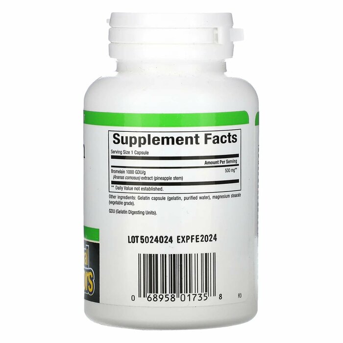 Бромелайн - это фермент, выделенный из стебля ананаса и используемый для поддержки пищеварительной системы. Natural Factors использует только бромелайн повышенной прочности, обеспечивая 1000 GDU (единиц переваривания желатина) и 1500 MCU (единиц свертывания молока) активности фермента на грамм.