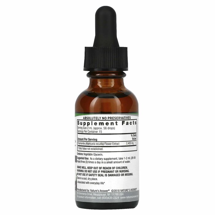 Nature's Answer предлагает все самое лучшее из цветков ромашки в суперконцентрированном экстракте без спирта. Этот чудесный экстракт способствует расслаблению и снятию стресса в повседневной жизни. Это идеальный выбор для тех, кто хочет сбавить темп жизни и просто расслабиться. Цветки ромашки от Nature's Answer не содержат спирта и глютена.