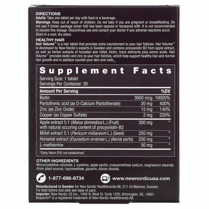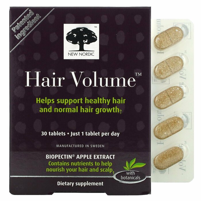 Hair Volume™ — это таблетка для волос, которая обеспечивает дополнительное питание волосяным фолликулам. Hair Volume™ разработан экспертами New Nordic в Швеции и содержит процианидин B2 из экстракта яблока, а также экстракты трав хвоща и проса, биотин, микроэлементы и аминокислоты. Hair Volume™ снабжает волосяные фолликулы биотином и цинком, которые помогают поддерживать здоровье волосы и их нормальный рост, а также питают кожу и ногти.