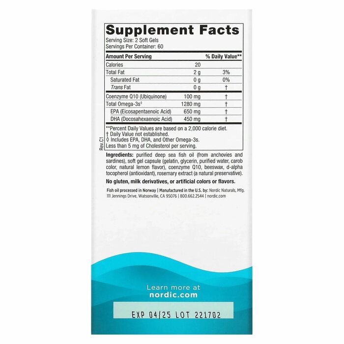 Ингредиенты Очищенное глубоководное рыбьего жира (от анчоусов и сардин), мягкая гелевая капсула (желатин, глицерин, очищенная вода, цвет рожкового дерева, натуральный лимонный аромат), коэнзим Q10, пчелиный воск, d-альфа-токоферол, экстракт розмарина (натуральный консервант).
