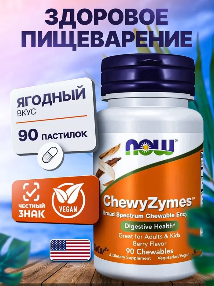 NOW Ферменты ChewyZymes отличаются высоким качеством и эффективностью. Продукт разработан с учетом потребностей людей, ведущих активный образ жизни, и тех, кто стремится к улучшению пищеварения и общего самочувствия. Жевательные таблетки имеют приятный вкус и не содержат искусственных добавок.