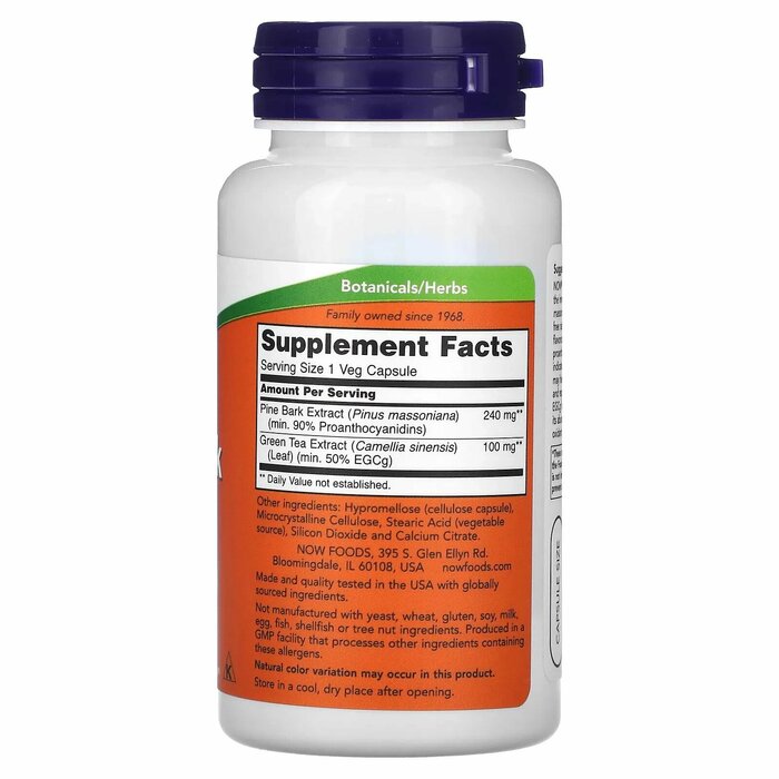 Экстракт сосновой коры от Now® получают из внутренней коры китайской красной сосны (Pinus massoniana), которая ценится за содержание эффективных полифенольных флавоноидов, улавливающие свободные радикалы, а именно олигомерных проантоцианидинов (OPC). Научные исследования показали, что экстракт коры китайской красной сосны способствует нормальному росту и размножению клеток. Экстракт зеленого чая с ECGg входит в состав этого продукта, поскольку он насыщен флавонолами, которые способствуют нейтрализации окислителей экстрактом сосновой коры.