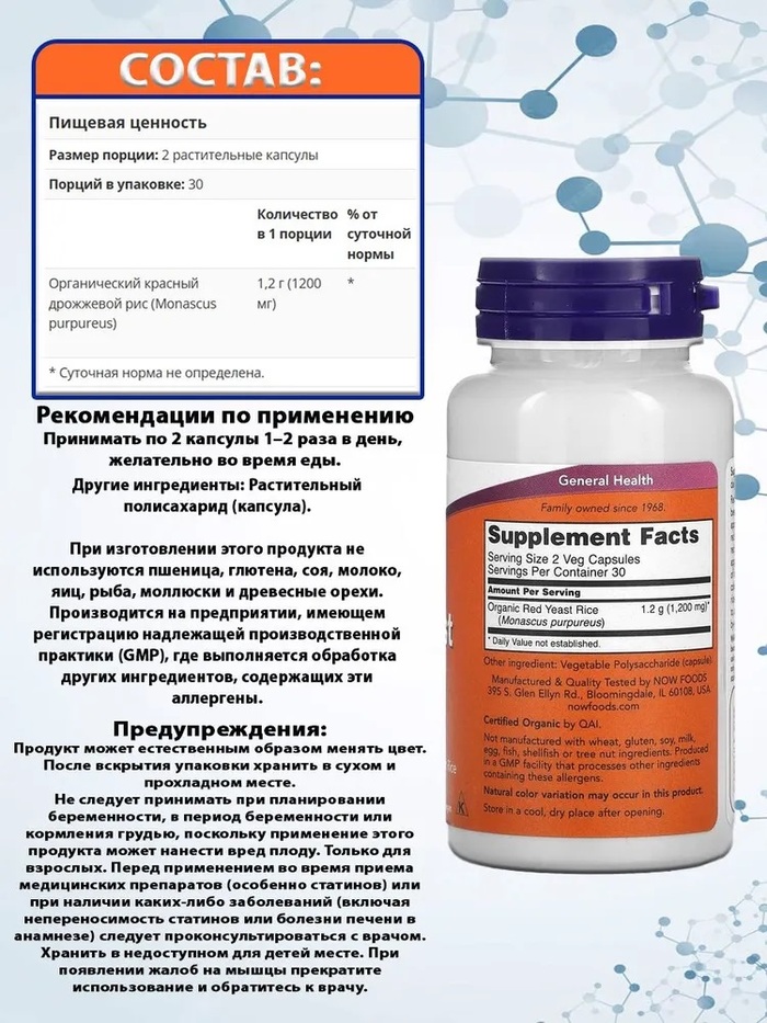 Красный ферментированный рис (RYR) — это натуральный продукт, который веками использовался азиатскими травниками. Его получают путем ферментации красных дрожжей (Monascus purpureus) с рисом. Этот продукт от NOW также содержит альфа-липоевую кислоту и коэнзим Q10 для защиты от свободных радикалов, а также силимарин для поддержки здоровой функции печени. Коэнзим Q10 также известен своими свойствами, поддерживающими сердечно-сосудистую систему. Этот продукт производится с тщательностью, чтобы избежать присутствия цитринина, нежелательного побочного продукта процесса ферментации RYR.