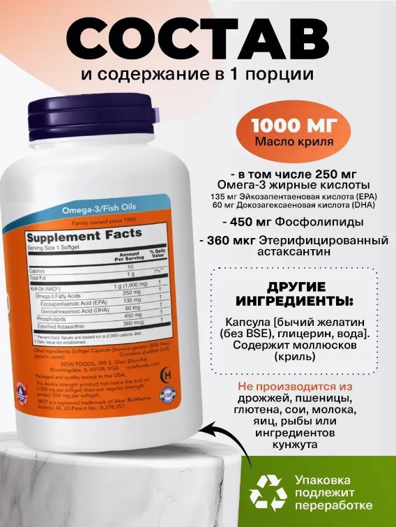 Масло криля известно своим уникальным профилем жирных кислот (ЖК), который включает ЭПК и ДГК, а также фосфолипиды. Кроме того, масло криля от природы содержит астаксантин, мощный поглотитель свободных радикалов и поддерживающий иммунитет каротиноид *. Клинические исследования показали, что масло криля NKO® может помочь поддерживать комфорт в суставах, поддерживать здоровый уровень липидов в крови, уже находящийся в пределах нормы, и может помочь поддержание здорового женского баланса. * Фосфолипидные формы ЭПК и ДГК из масла криля также продемонстрировали исключительно высокую биодоступность.