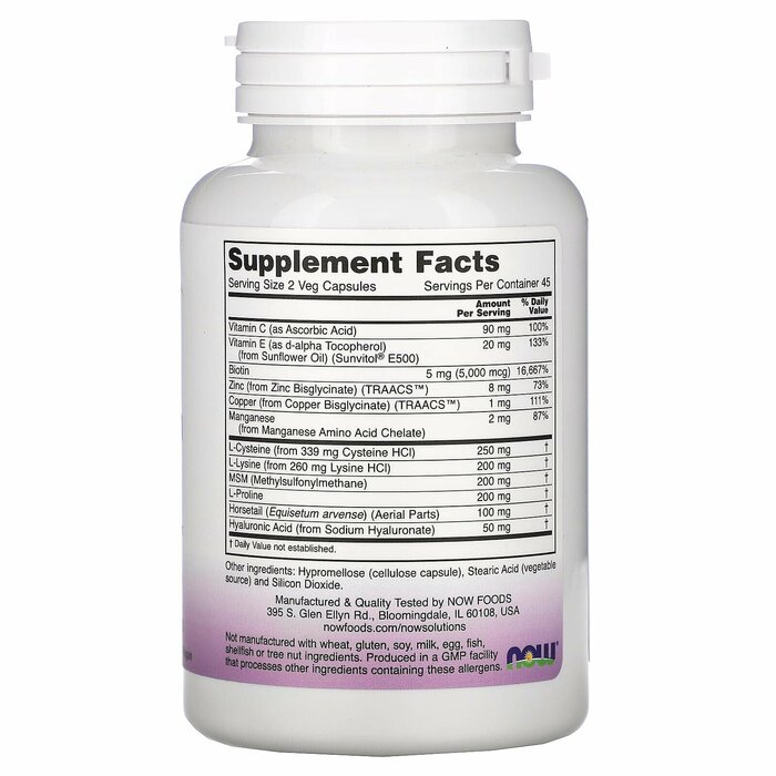 Добавка для здоровья волос, кожи и ногтей от NOW ® Solutions работает на клеточном уровне, помогая поддержать естественную красоту изнутри. Эта полностью веганская формула содержит аминокислоты и микроэлементы, которые необходимы для выработки коллагена и кератина — основных структурных компонентов волос, кожи и ногтей. Кроме того, в состав включены антиоксидантные витамины C и E, помогающие защитить кожу от свободных радикалов, а также биотин и гиалуроновая кислота, которые поддерживают здоровье и молодость кожи.