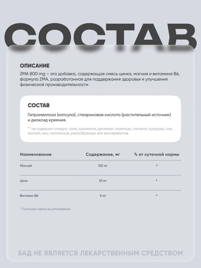 ZMA® — это сочетание цинка, магния и витамина B6, которые максимально быстро всасываются и способствуют восстановлению после физической активности. Цинк играет центральную роль в регулировании роста клеток и восстановления тканей, а также в поддержании здоровой иммунной системы. Магний необходим для сохранения водно-солевого баланса, производства энергии и сохранения нормальной нервно-мышечной функции. Поскольку физическая активность может увеличить потребность в этих двух микроэлементах, ZMA® является идеальной добавкой для их восполнения.