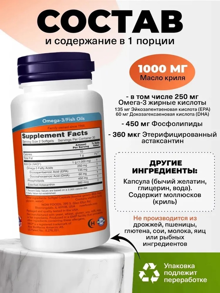 Продукт представлен в удобных капсулах и подходит для ежедневного применения. Он не содержит искусственных добавок, глютена и других аллергенов, что делает его безопасным для большинства людей. NOW Масло криля — это отличный выбор для тех, кто хочет поддержать здоровье сердца, улучшить состояние суставов и повысить общий уровень энергии с помощью натуральных и легко усвояемых омега-3 жирных кислот.