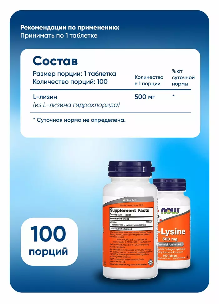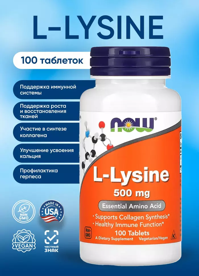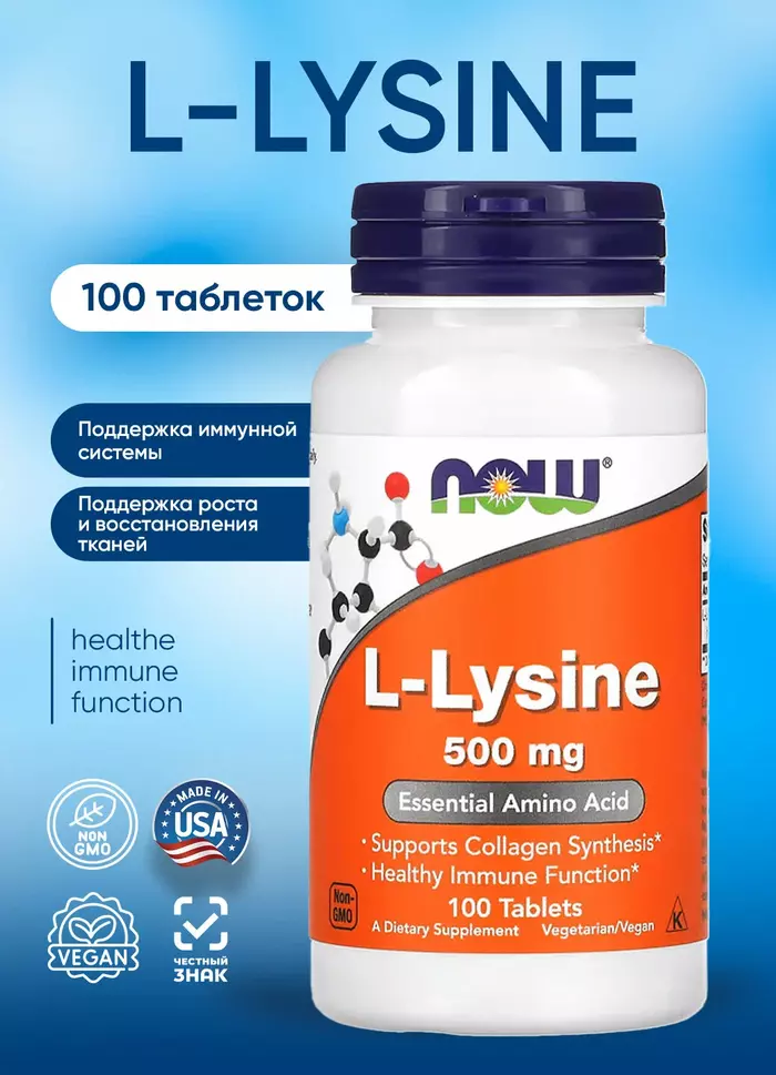 NOW Аминокислота L-Лизин (500 мг) — это высококачественная добавка с аминокислотой L-лизин, которая играет важную роль в поддержке иммунной системы, улучшении синтеза коллагена и повышении общего уровня здоровья.