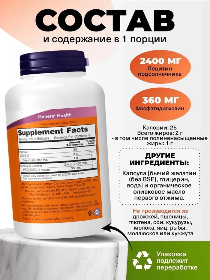 NOW Подсолнечный лецитин (1200 мг), 100 капсул