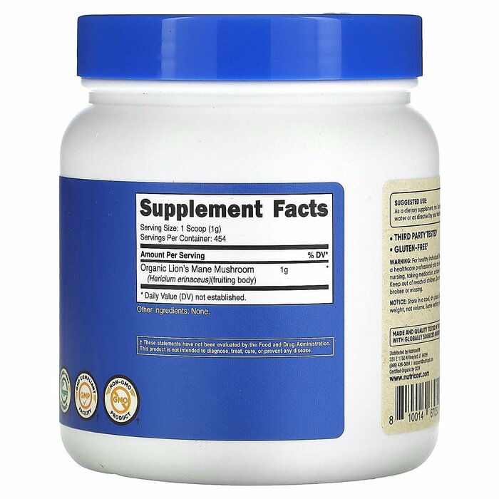 Nutricost Органический гриб ежовик гребенчатый без добавок, 454 г