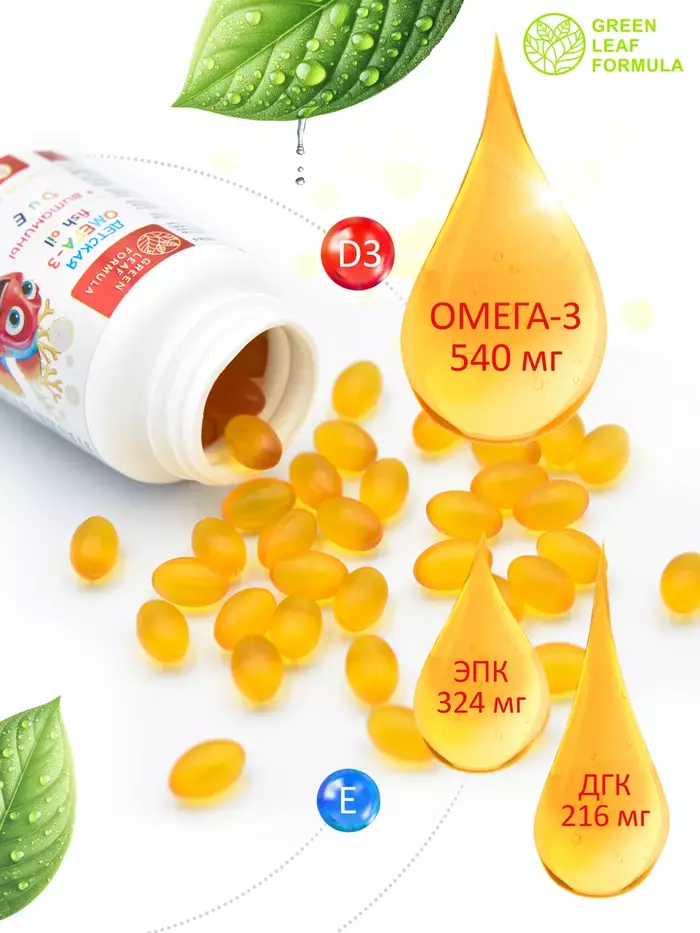 KID’s OMEGA3 fish oil это комплекс витаминов для детей от 3 лет и подростков, витамины для школьников, для растущего организма ребенка на основе Омега 3 рыбий жир, обогащенного витамином Д3 в форме холекальциферола и витамином Е.Детская OMEGA 3 выпускаются в форме мягкой жевательной желатиновой капсулы со вкусом лимона, капсулы можно жевать или глотать.Дефицит ПНЖК у детей ведет к задержке роста и развития, изменениям со стороны кожи, снижению иммунитета.ПНЖК в продукте не менее 540 мг и оптимальное соотношение ЭПК к ДГК: ЭПК 324, ДГК 216 мг (в 4 капсулах).Витаминный комплекс предназначен: для повышения мыслительных способностей, памяти и внимания; для формирования костной ткани (минерализация костных тканей), особенно в период развития ребенка; для улучшения волос, кожи и ногтей; для моделирования иммунных функций организма и выработки врожденного антимикробного иммунитета; для правильного развития и улучшения работы сердца и сосудов; для улучшения обменных процессов в организме.В препарате использована натуральная первозданная триглицеридная 30% форма Омега 3 рыбного жира из Исландии, который произведен из мышечной ткани мелких пород диких рыб, таких как: корюшкообразные, ставридовые, сельдеобразные, окунеобразные. Для лучшей очистки рыбного жира от солей тяжелых металлов и аллергенов, применяется метод молекулярной дистилляции, который гарантирует сохранение структуры жирных кислот. Омега3 в форме триглицеридов имеет высокую биодоступность, быстро и хорошо усваивается организмом человека.Не содержит: диоксид титана, химический краситель, ГМО, сою, глютен.Противопоказания: Индивидуальная непереносимость компонентов. Перед применением рекомендуется проконсультироваться с врачом, перед применением БАД детьми рекомендуется проконсультироваться с врачомпедиатром.