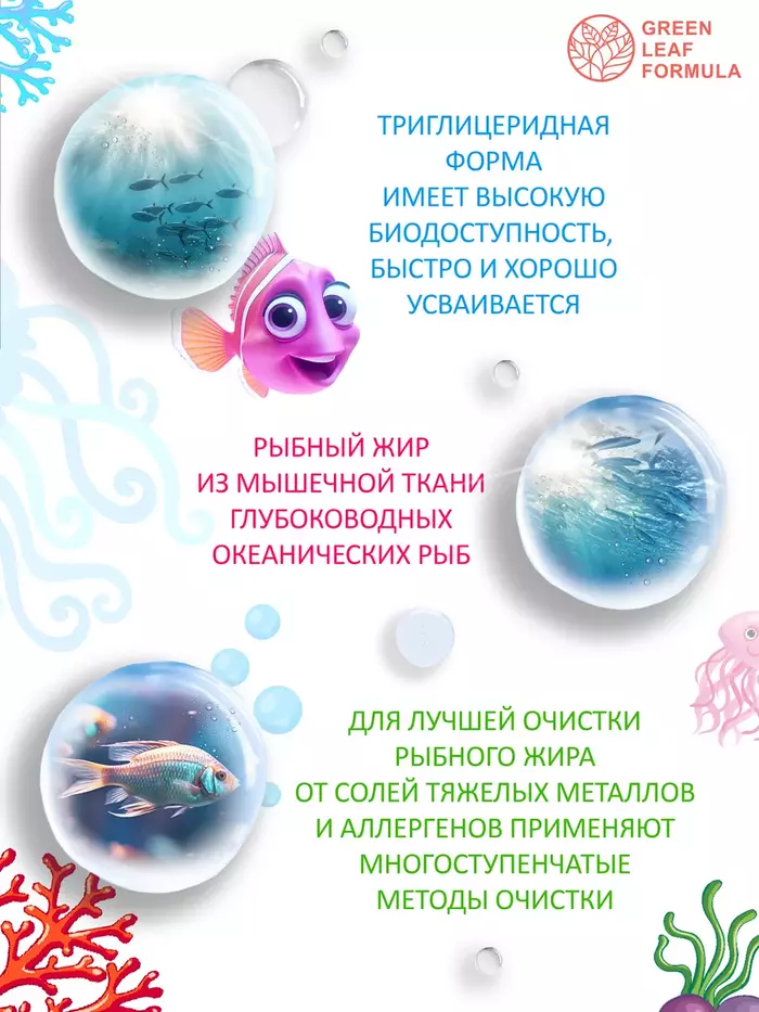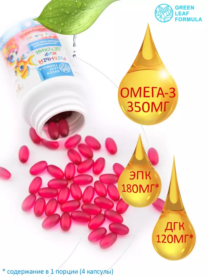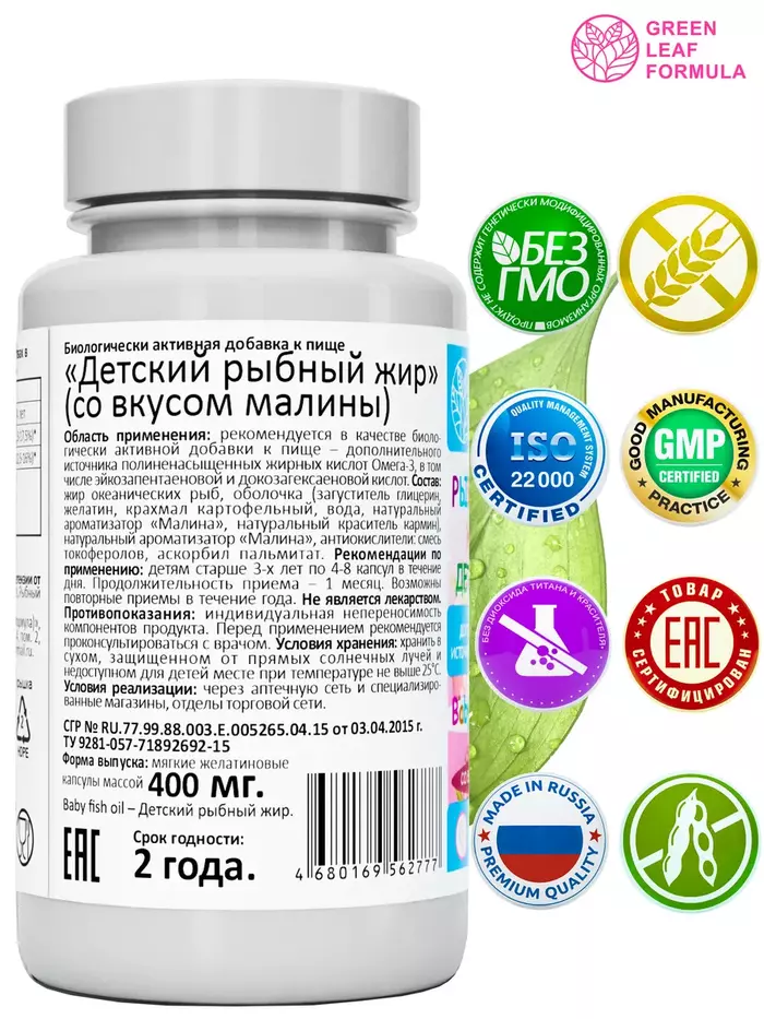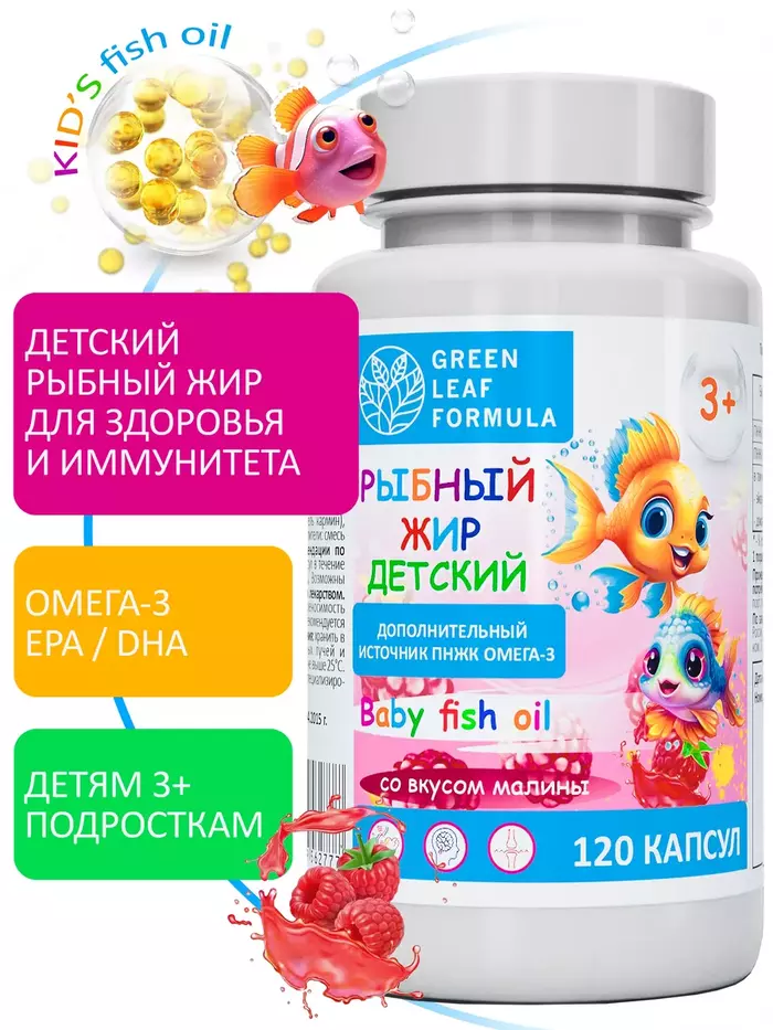 Детский рыбный жир в капсулах со вкусом малины для детей от 3 лет, для роста и развития ребенка, витамины для школьников и подростков.Содержание в продукте в 1 суточной порции (4 капсулы):· Эйкозапентаеновая кислота (ЭПК / EPA) 180 мг.· Докозагексаеновая кислота (ДГК / DHA) 120 мг.· ПНЖК омега3 350 мг.В препарате использован жир океанических рыб, натуральный ароматизатор. OMEGA 3:• дефицит ПНЖК у детей ведет к задержке роста и развития, изменениям со стороны кожи, снижению иммунитета;• способствует улучшению состояния сердечнососудистой системы, защищает сердечную мышцу ребенка от воздействия токсинов и инфекционных агентов;• повышает когнитивные функции мозга память, внимание, обучаемость;• участвует в формировании нервной системы ребенка, повышает нейромышечную функцию, выносливость, общий тонус мускулатуры;• волосяные луковицы укрепляются, органические соединения вещества питают фолликулы, нормализуя их работу;• способствует улучшению качества кожи, ускоряет заживление, служит важным компонентом лечения хронических дерматитов;• особенно важен для иммунитета и правильной работы всех систем организма. Наш обычный рацион не способен обеспечить поступление полиненасыщенных жирных кислот в должном объеме. Поэтому важно компенсировать недостатки питания приемом Омега3 жирные кислоты, начиная уже с раннего возраста. ОМЕГА3 КАК ИСТОЧНИК ДОЛГОЛЕТИЯ И КРАСОТЫ. Существует доказательная база, достаточная для утверждения, что каждый человек, проживающий в регионе с обедненным содержанием Омега3 ПНЖК в рационе (в том числе вся территория России), должен дополнительно к пище принимать препараты с ЭПК и ДГК для профилактики возрастассоциированных заболеваний, неинфекционных хронических патологий, увеличения продолжительности и качества жизни в целом.Не содержит: диоксид титана, химический краситель, ГМО, сою, глютен.Состав: жир океанических рыб, оболочка (глицерин (загуститель), желатин, крахмал картофельный, вода, ароматизаторы натуральные («Малина»), красители натуральные (кармин)), ароматизаторы натуральные («Малина»), антиокислители (смесь токоферолов, аскорбил пальмитат).Способ применения: детям старше 3х лет по 48 капсул в течение дня. Продолжительность приема 1 месяц. Возможны повторные приемы в течение года. Перед применением рекомендуется проконсультироваться с врачом.Форма выпуска: 120 капсул по 400 мг. Витамины и БАДы Green Leaf Formula это забота о вашем здоровье каждый день. Вся наша продукция сертифицирована и изготавливается на одном из ведущих российских производств, проходя многоэтапный контроль качества. Непрерывный лабораторный контроль входного сырья и готовой продукции ведется лабораторией, аккредитованная в национальной системе Росаккредитации. Соответствие международным стандартам ISO 22 000 : 2005, GMP и серьезная научная база, гарантируют потребителю приобретение продукта высочайшего качества.