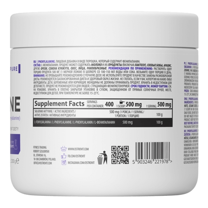 Отдельные аминокислоты Ostrovit Phenylalanine 200 гр. — это высококачественная добавка, содержащая фенилаланин, который является незаменимой аминокислотой, необходимой для синтеза белков в организме.
