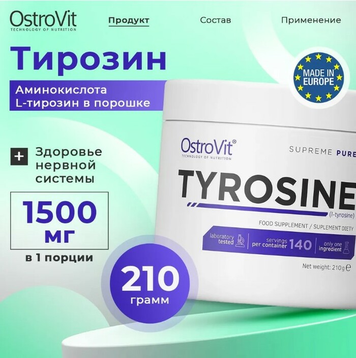 • Поддержка щитовидной железы: Тирозин участвует в синтезе гормонов щитовидной железы, что важно для метаболизма.