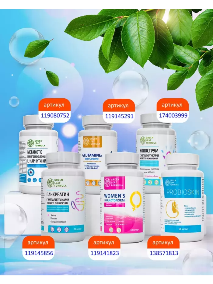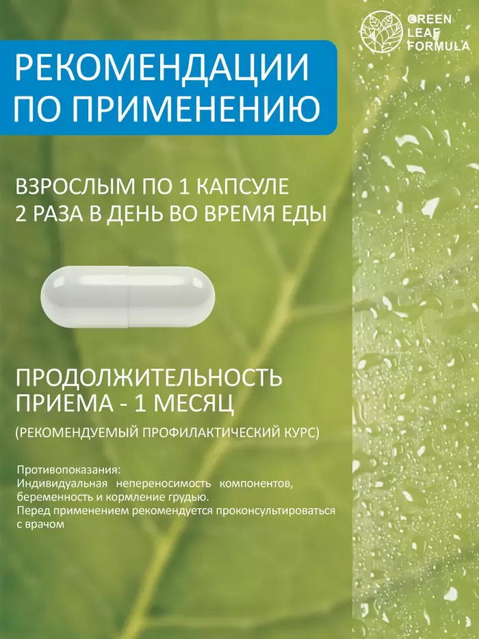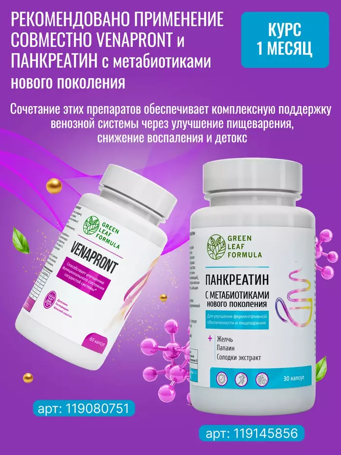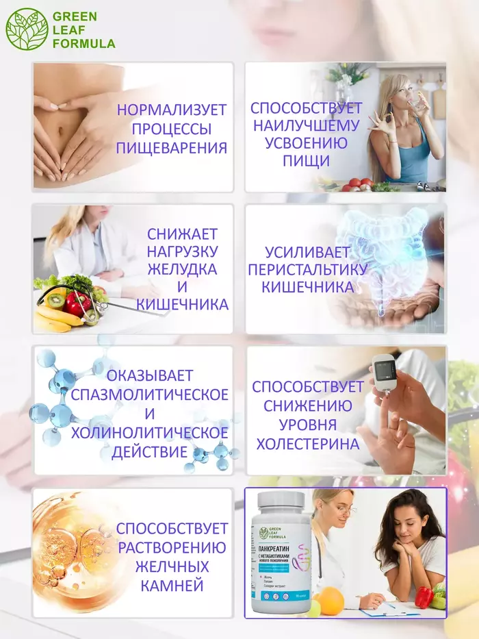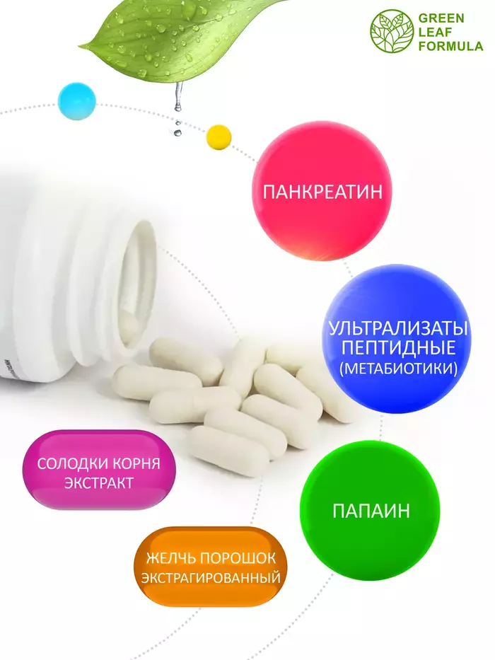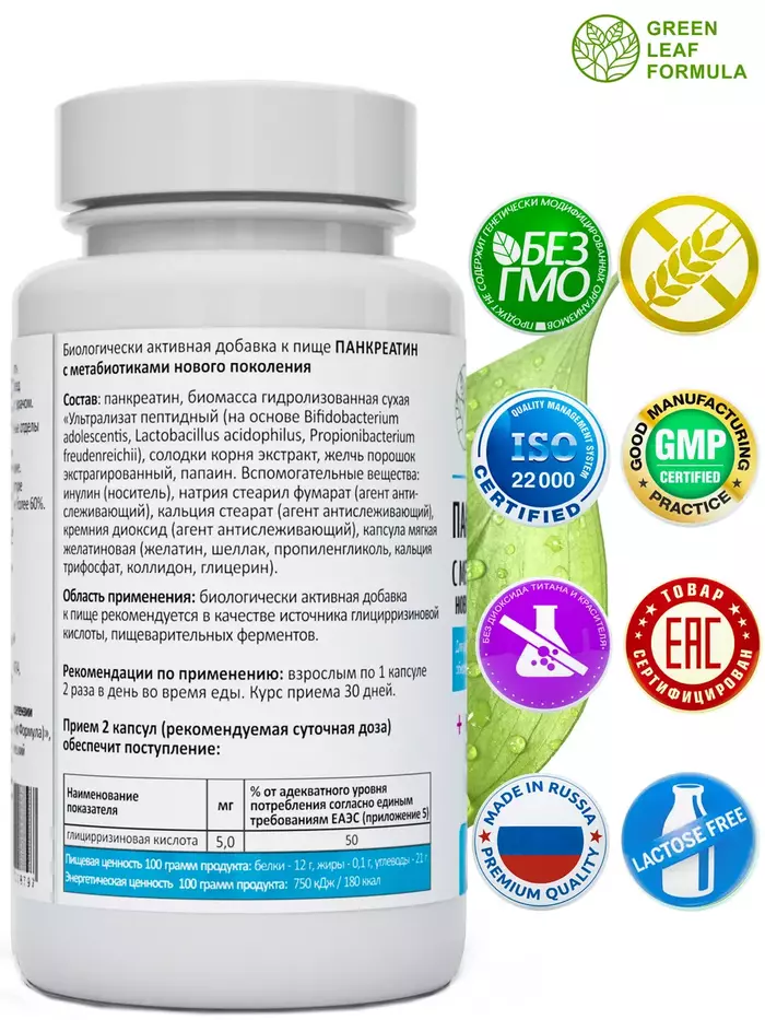 Панкреатин с метабиотиками нового поколения – препарат для улучшения ферментативной обеспеченности и улучшения процессов пищеварения. Панкреатин таблетки в форме капсул способствуют наилучшему усвоению пищи и снижению токсической нагрузки желудка и кишечника, оказывают спазмолитическое и холинолитическое действие. Эффективность таблеток для пищеварения в форме капсул достигается за счет синергии панкреатина, метабиотиков, желчи, папаина и экстракта солодки. Функционал пищевой добавки: • Обеспечивает организм необходимыми ферментами – липаза, протеаза, амилаза. Способствует расщеплению белков, жиров и углеводов, нормализуя процессы пищеварения и снижая нагрузку на желудок. Способствует более полному всасыванию белков, жиров и углеводов в тонком кишечнике, снижая нагрузку на кишечник. Поддерживает гомеостаз микробиоты в кишечнике. Нормализует микрофлору и усиливает перильстатику кишечника. Способствует растворению желчных камней. Способствует снижению холестерина в крови. Способствует нормализации работы нервной и эндокринной системы. Обладает противовоспалительным, спазмолитическим, антисептическим и иммуномодулирующим действием. Метабиотики в составе препарата получены на основе ноухау безлактозной биотехнологии. Препарат лишен молочных аллергенов, а за счет используемой технологии микрокапсулирования метабиотики устойчивы к кислоте желудка и активны в кишечнике, устойчивы к антибиотикам, имеют высокую скорость действия и не требует специальных условий хранения.Не содержит: диоксид титана, химический краситель, ГМО, глютен, лактозу. Витамины и БАДы Green Leaf Formula это забота о вашем здоровье каждый день.  Вся наша продукция сертифицирована и изготавливается на одном из ведущих российских производств, проходя многоэтапный контроль качества. Непрерывный лабораторный контроль входного сырья и готовой продукции ведется лабораторией, аккредитованная в национальной системе Росаккредитации. Соответствие международным стандартам ISO 22 000 : 2005, GMP и серьезная научная база, гарантируют потребителю приобретение продукта высочайшего качества.