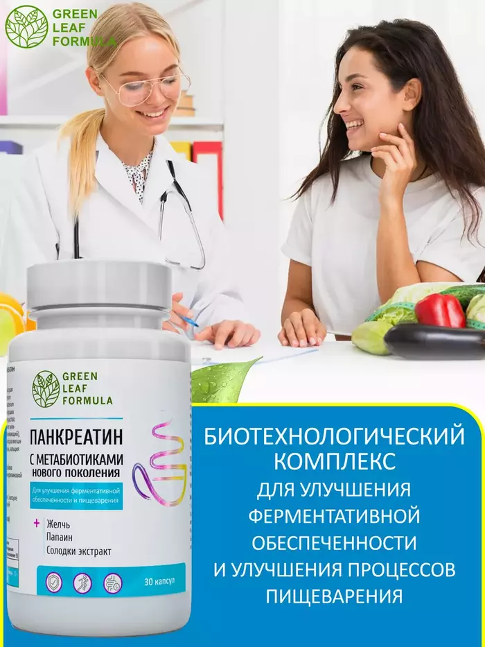 GREEN LEAF FORMULA Панкреатин и метабиотики ферменты для пищеварения, 30 капсул