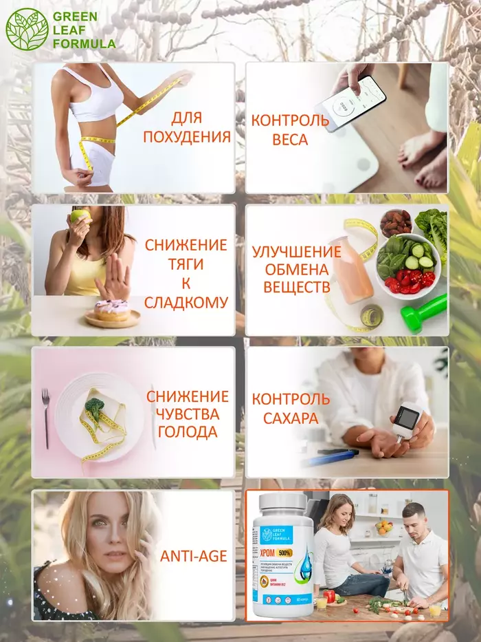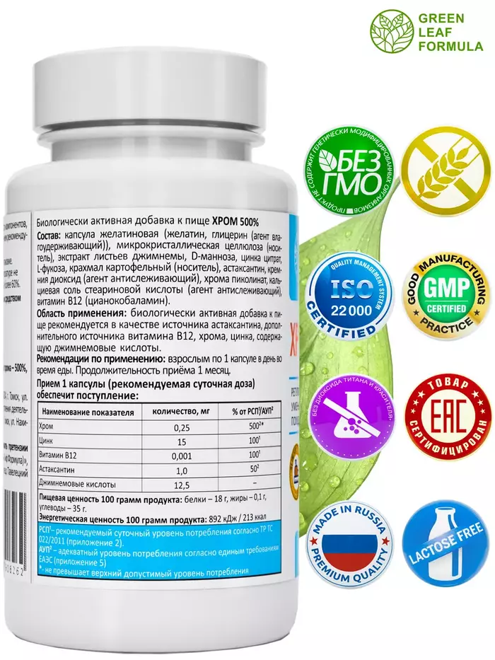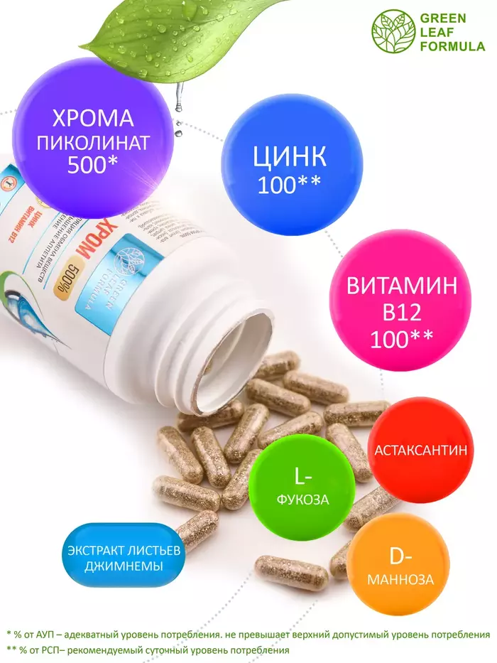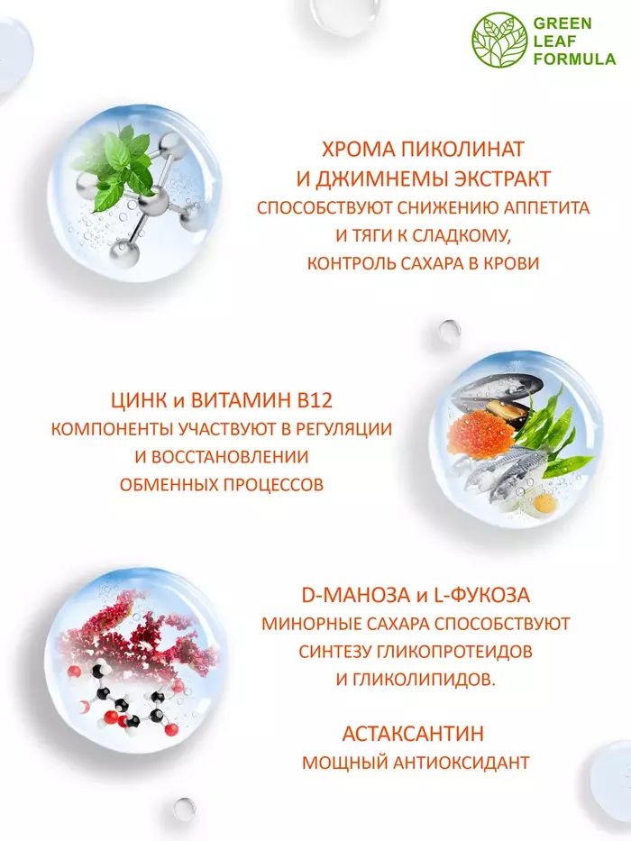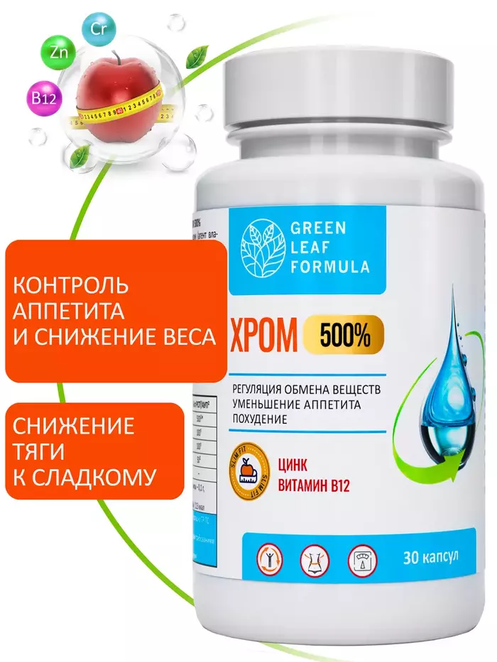 Комплекс на основе хрома пиколината, цинка, витамина В12 и экстракта джимнемы для регуляции обменных процессов, уменьшения аппетита, для похудения и снижения веса.Комплекс способствует:• снижению чувства голода и тяги к сладкому;• улучшению углеводного обмена, повышению чувствительности клеток к инсулину;• нормализации и восстановлению обменных процессов;• снижению веса;• снижению уровня сахара в крови, уменьшая образование жира;• снижению окислительного процесса в организме и продлению молодости. Хрома пиколинат – легкоусвояемая форма хрома, принимает участие в регуляции углеводного и жирового обмена. Необходим для нормальной работы каналов, через которые проходит в клетки глюкоза; работает в связке с инсулином и помогает перемещению глюкозы из крови в ткани.Благодаря джимнемовым кислотам замедляются процессы всасывания лишнего сахара из пищи, поэтому он не попадает в кровь и безопасно выводится из организма; кроме того, джимнемовые кислоты поддерживают работу поджелудочной железы и здоровую выработку инсулина. Вместе пиколинат хрома и джимнема способствуют снижению аппетита и тяги к сладкому. Цинк отвечает за обменные процессы в организме, в частности, за обмен жиров и углеводов.Витамин B12 участвует в восстановлении обмена веществ. Это важный компонент в профилактике заболеваний сердечнососудистой системы, нервной системы, для людей с метаболическим синдромом и с сахарным диабетом. Минорные сахара Dманоза и Lфукоза способствуют синтезу гликопротеидов и гликолипидов, и строительству нормальных рецепторов к инсулину.Комплекс рекомендуется также принимать в комплексной терапии при сахарном диабете первого и второго типа, инсулинорезистентности и осложнений, возникающих вследствие хронической гипергликемии.Противопоказания: индивидуальная непереносимость компонентов, беременность и кормление грудью. Перед применением рекомендуется проконсультироваться с врачом.Витамины и БАДы Green Leaf Formula — это забота о вашем здоровье каждый день. Вся наша продукция сертифицирована и изготавливается на одном из ведущих российских производств, проходя многоэтапный контроль качества. Непрерывный лабораторный контроль входного сырья и готовой продукции ведется лабораторией, аккредитованная в национальной системе Росаккредитации. Соответствие международным стандартам ISO 22 000 : 2005, GMP и серьезная научная база, гарантируют потребителю приобретение продукта высочайшего качества.