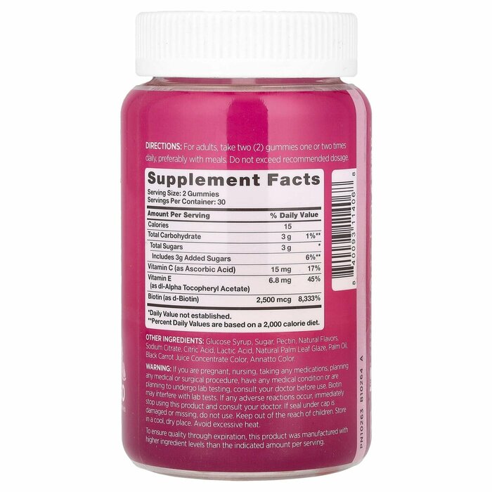 Если вы беременны, кормите грудью, принимаете какие-либо лекарства, планируете какие-либо медицинские или хирургические процедуры, страдаете каким-либо заболеванием или планируете пройти лабораторные исследования, проконсультируйтесь с врачом перед использованием. Биотин может помешать лабораторным тестам. При возникновении любых побочных реакций следует прекратить прием и обратиться к врачу. Не следует использовать данный продукт, если защитная пленка под крышкой повреждена или отсутствует. Хранить в недоступном для детей месте. Хранить в сухом и прохладном месте. Избегать воздействия высоких температур.