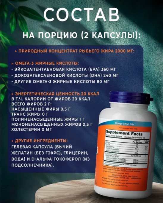NOW Омега 3 Рыбий жир (1000 мг), 100 капсул