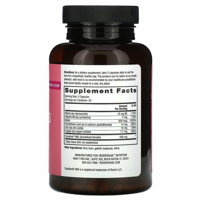 Кератин Reserveage для волос и ногтей с биотином создает мощный, готовый к употреблению кератин с уникальной биодоступностью, содержащий 18 аминокислот, включая цистеин.5 Наряду с биотином он содержит другие питательные вещества B-комплекса, а также жизненно важные минералы медь и цинк.