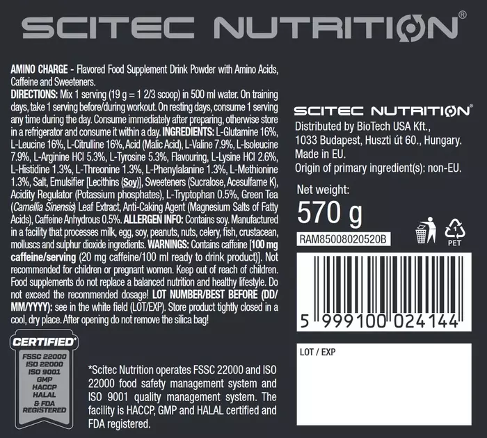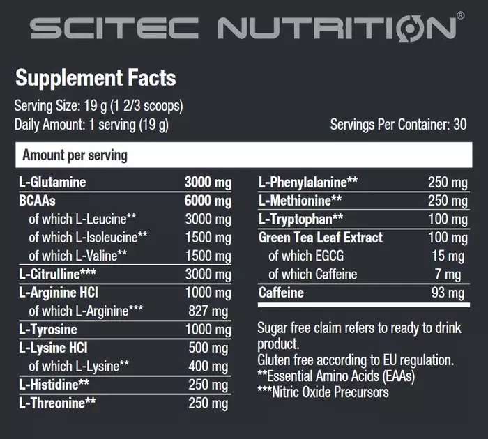 Кроме незаменимых аминокислот, "Амино CHARGE" включает дополнительные активные ингредиенты, такие как L-глутамин (3000 мг), L-аргинин HCl (1000 мг), L-тирозин (1000 мг) и L-цитруллин (3000 мг), которые способствуют повышению синтеза оксида азота, увеличивают поставки кислорода к мышцам и снижают время восстановления после физической нагрузки.