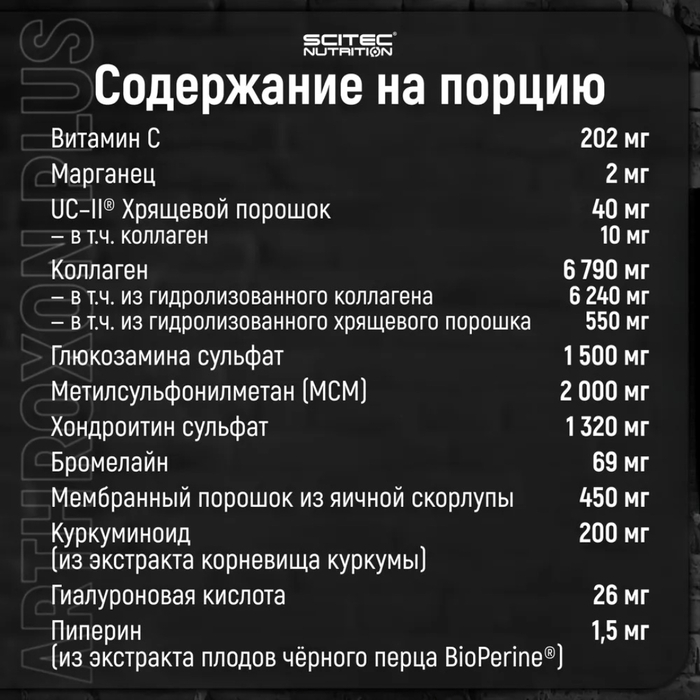 Scitec Nutrition Комплекс для связок и суставов Arthroxon Plus Лимон-Апельсин — это мощный комплекс, разработанный для поддержания здоровья суставов и связок. Этот 8-компонентный порошок включает в себя хорошо известные хондропротекторы, такие как глюкозамин сульфат, хондроитин сульфат и гидролизованный куриный коллаген типа II, которые вместе укрепляют и восстанавливают хрящевую и соединительную ткани.