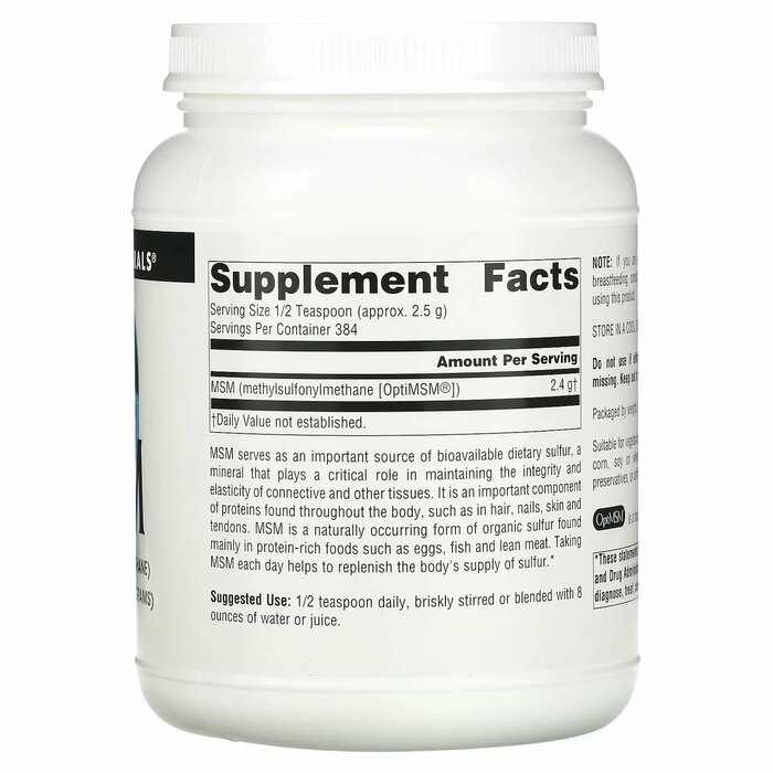 МСМ — важный источник пищевой серы в биологически доступной форме. Данный микроэлемент играет важную роль в сохранении целостности и эластичности соединительной и других тканей. Это важный компонент белков, содержащихся во всем организме (например, в волосах, ногтях, коже и сухожилиях). МСМ является натуральной формой органической серы, содержащейся в основном в богатой белком пище, такой как яйца, рыба и нежирное мясо. Ежедневный прием МСМ помогает восполнить недостаток серы в организме.