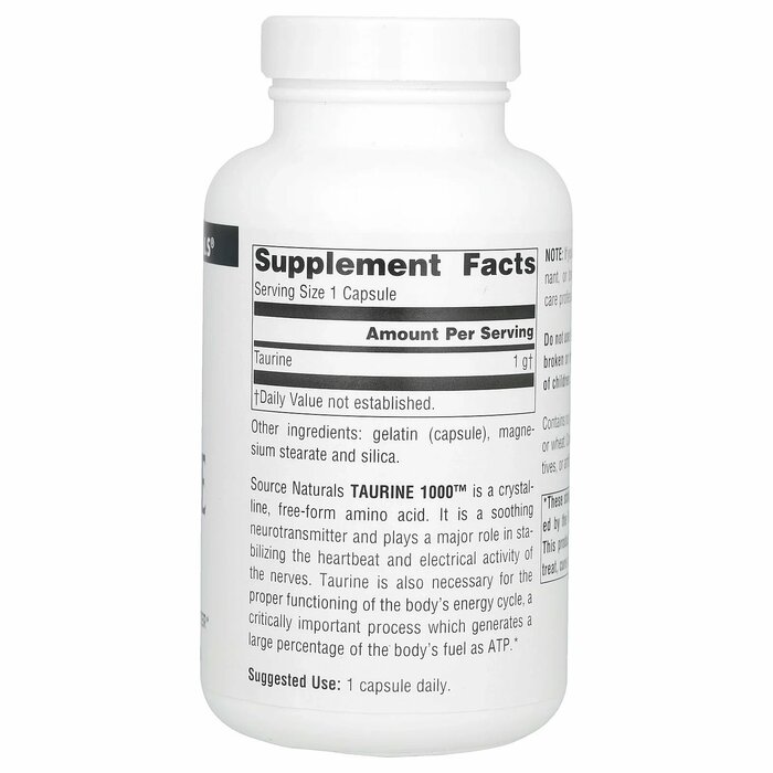 Source Natural Taurine 1000 - это кристаллическая аминокислота свободной формы. Это успокаивающий нейротрансмиттер, который играет важную роль в стабилизации сердцебиения и электрической активности нервов. Таурин также необходим для надлежащего функционирования энергетического цикла организма, важнейшего процесса, который генерирует большое количество АТФ.
