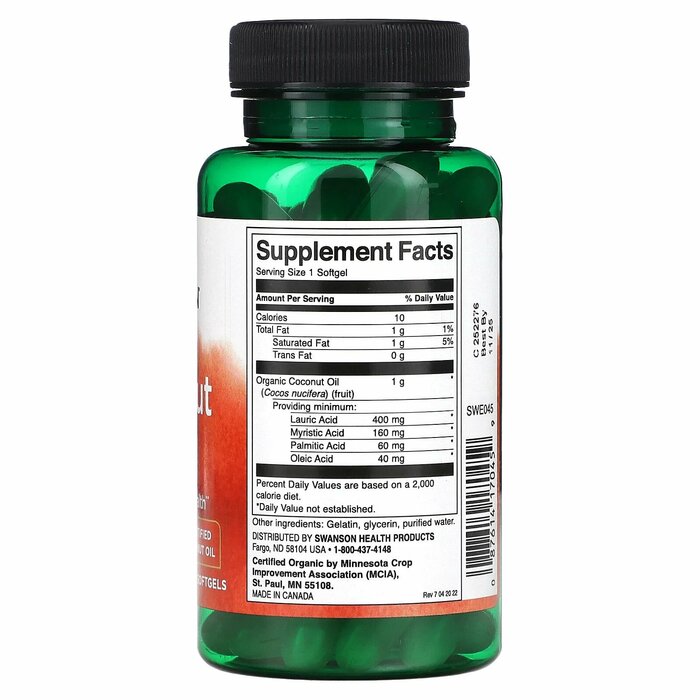 Капсулы с кокосовым маслом Swanson EFA - отличный способ включить в рацион повышающие уровень энергии среднецепочечные триглицериды. Среднецепочечные триглицериды отличаются тем, что они быстро всасываются в тонком кишечнике и быстро используются для получения энергии. Кокосовое масло также является полезным источником жирных кислот, особенно лауриновой кислоты. Организм быстро перерабатывает их для получения энергии. Наша добавка с кокосовым маслом первого отжима изготовлена из сертифицированного органического кокосового масла и содержит 400–560 мг лауриновой кислоты на порцию.
