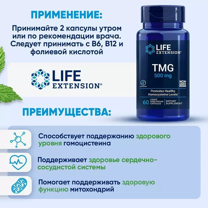 Life Extension TMG не содержит глютен и ГМО, что подтверждено сертификатом Non GMO LE Certified. Продукт безопасен для вегетарианцев и включает такие ингредиенты, как глицерин, растительная целлюлоза и очищенная вода. Рекомендуется принимать две капсулы в день, желательно утром или по назначению лечащего врача, для максимальной эффективности в сочетании с кофакторами B6, B12 и фолиевой кислотой.