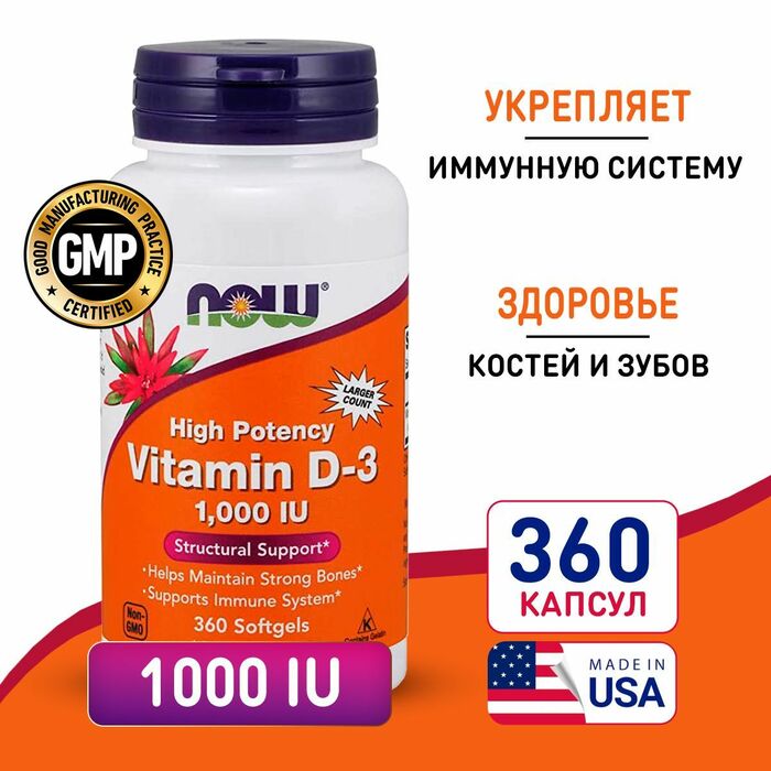 Витамин D3 от NOW (1000 МЕ) содержит высокоактивную форму витамина D3 (холекальциферола) в легкоусвояемых мягких желатиновых капсулах. Каждая капсула содержит 25 мкг (1000 МЕ) витамина D3, что соответствует 125% рекомендованной суточной нормы. Этот витамин необходим для правильного усвоения и использования кальция и фосфора в организме.