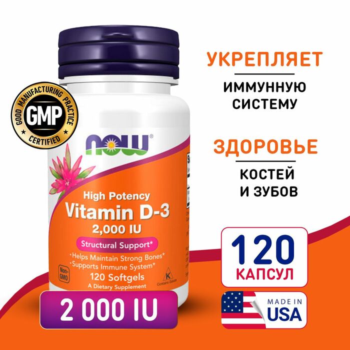 NOW Vitamin D3 2000 ME 120 sgels – надежный продукт от ведущего производителя спортивных добавок NOW. Этот витамин необходим для поддержания иммунитета, крепких костей и зубов.