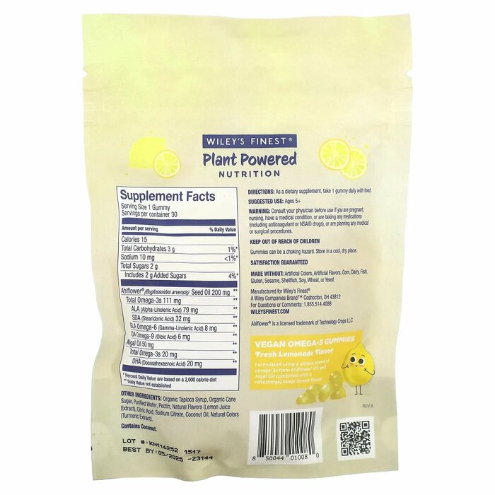 Wiley's Finest Пищевая добавка с Омега-3 для детей Plant Powered Nutrition Свежий лимонад (131 мг), 30 жевательных табл